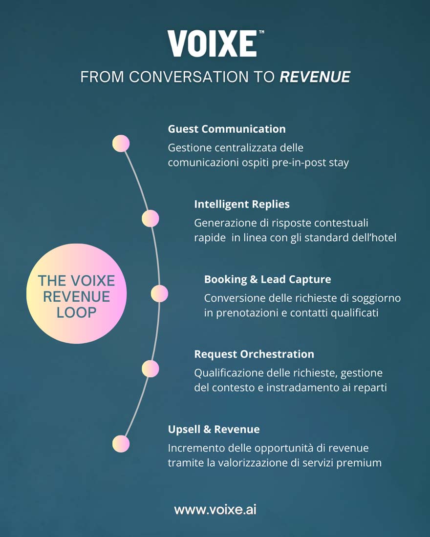 VOIXE automatizza e gestisce la comunicazione multicanale con gli ospiti, trasformandola in prenotazioni, coordinamento tra reparti e revenue diretta.